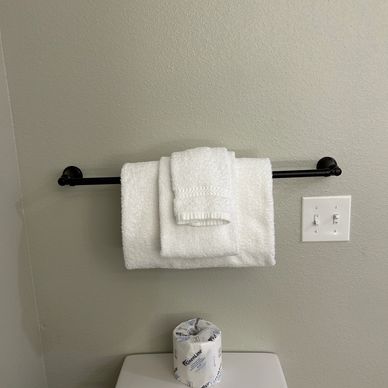 1 Bath Towel Standard Fold placed on the towel rack located by the toilet area.